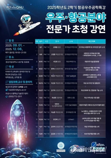 관심 있는 사람은 경상국립대학교 항공우주시스템연구소 누리집에서 자세한 일정과 강연 주제, 초청 강사를 확인하면 된다.