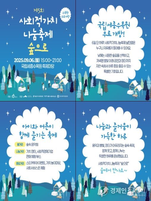 경제인투데이 류현민 기자 | 한국사회적기업진흥원은 오는 9월 6일 15시부터 21시까지 국립세종수목원 축제마당에서'제5회 사회적가치 나눔축제, 숲으로'를 공동 개최한다.