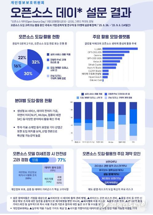 개인정보위가 행사에 앞서 진행한 간이 설문에 따르면, 설문에 참여한 70명의 개발자·연구자 및 기업 관계자 중 약 62%가 오픈소스를 도입·활용한 경험이 있으며, 오픈소스 모델을 활용한 미세조정 시 안전성을 고려한 경험이 있다고 응답한 비율은 77%에 달했다.