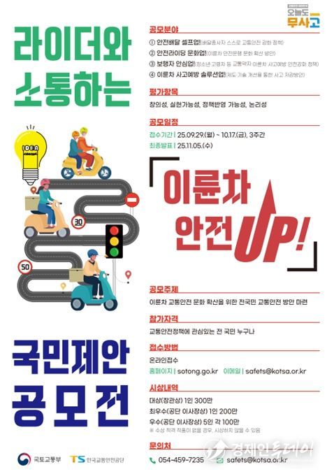 경제인투데이 류현민 기자 | 국토교통부와 한국교통안전공단은 대한민국의 교통안전을 더욱 강화하기 위해 '이륜차 안전UP! 정책 공모전'을 개최한다.