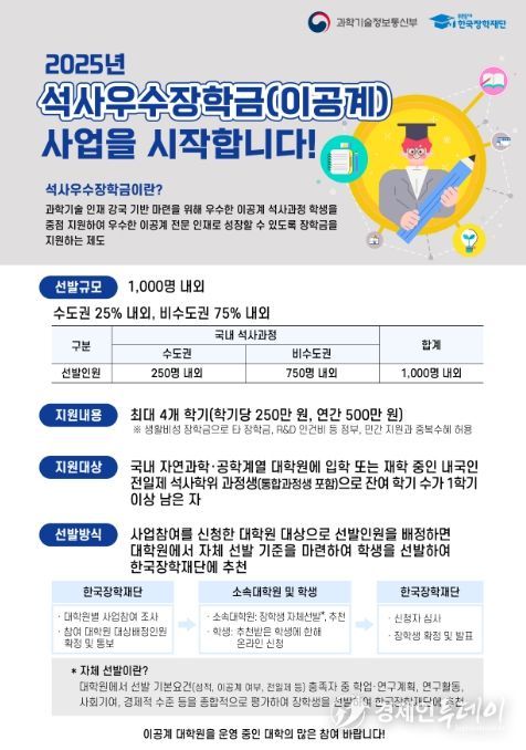 이공계 석사우수장학금 사업은 경력 초기 단계의 석사학위 과정생을 중점 지원하여 과학기술 우수인재로 성장할 수 있도록 장학금을 지원하는 사업이다. 과기정통부는 우수 이공계 대학원생 지원을 확대 중으로, 2024년 대학원 대통령과학장학금, 2025년 이공계 석사우수장학금을 새롭게 도입했고, 내년에는 이공계 박사우수장학금을 신규 도입하여 과학기술 인재 강국 실현을 위한 청년 과학기술인의 전주기 성장지원 체계를 강화할 계획이다.