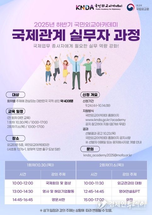경제인투데이 류현민 기자 | 외교부 국립외교원은 2025년 하반기 국민외교아카데미 국제관계 실무자 과정 참가자를 9월 24일부터 10월 14일까지 모집한다.