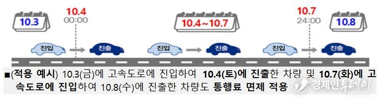 통행료 면제 기간 및 대상은 10월 4일 00시부터 10월 7일 24시까지 잠시라도 고속도로를 이용하는 차량에 적용된다.