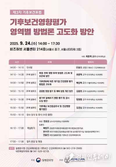 경제인투데이 류현민 기자 | 질병관리청은 대한예방의학회(회장 홍영습)와 함께 '3차 기후보건포럼'을 9월 24일 오후 2시, 비즈허브 서울센터(서울시 중구 소재)에서 개최한다.