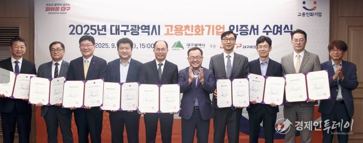 경제인투데이 류현민 기자 | 대구광역시는 9월 29일 오후 3시, 시청 산격청사에서 ‘2025년 고용친화기업 인증서 수여식’을 열고, 고용 창출 및 근무환경이 우수한 고용친화기업 신규 5개사와 재인증 6개사를 선정해 인증서를 수여했다.