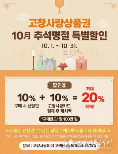 이번 특별할인은 △상품권 구매시 10% 선할인 △고창사랑카드 결제시 10% 캐시백 적립을 통해 최대 20% 혜택을 받을 수 있도록 구성됐다.
