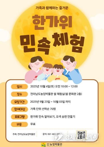 경제인투데이 류현민 기자 | 전라남도 농업박물관은 다가오는 한가위를 맞아 가족 단위 관람객 대상으로 ‘한가위 민속 체험행사’를 10월 4일에 개최한다고 밝혔다.