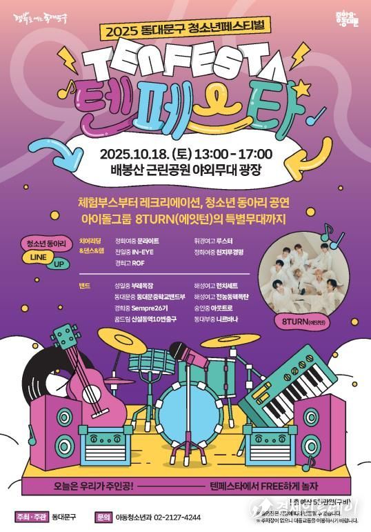 경제인투데이 류현민 기자 | 서울 동대문구는 오는 18일 오후 1시부터 5시까지 배봉산근린공원 열린광장에서'2025 동대문구 청소년 페스티벌 ‘텐 페스타(TEN FESTA)’'를 개최한다고 밝혔다.