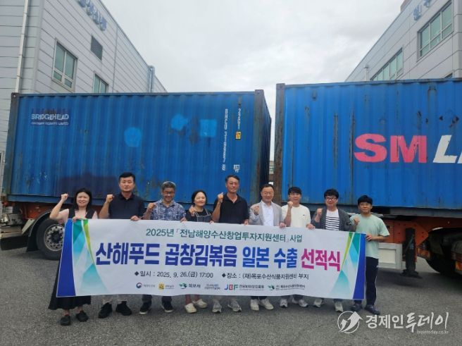 경제인투데이 류현민 기자 | (재)목포수산식품지원센터는 9월 26일, 전남해양수산창업투자지원센터 사업 수혜기업인 산해푸드(대표 오시윤)가 일본 바이어와 체결한 2만3천 달러(한화 약 3천2백만 원) 규모의 곱창김 제품 수출 계약에 따라 센터에서 선적식을 개최했다고 밝혔다.
