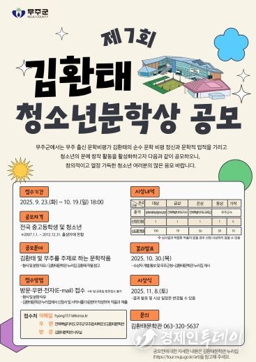 경제인투데이 류현민 기자 | 무주군이 전국의 중·고등학생 및 청소년(2007.1.1.~2012.12.31. 출생자에 한함)을 대상으로 제7회 김환태 청소년문학상에 도전하는 작품 공모에 나섰다.