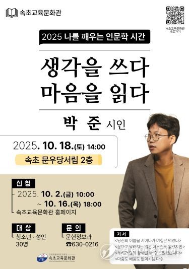 안영자 속초교육문화관장은 “자신의 생각과 마음을 표현하는 방법을 알아가는 이번 강연이 일상 속 작은 위로와 새로운 영감을 얻는 소중한 시간이 되기를 바란다”며 “지역주민과 청소년들의 많은 관심과 참여를 부탁드린다”고 전했다.