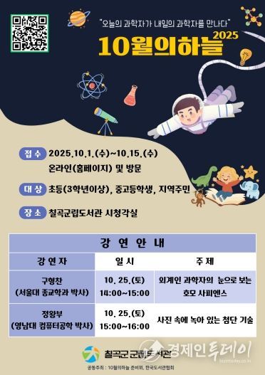 경제인투데이 류현민 기자 | 칠곡군립도서관은 한국도서관협회와 10월의 하늘 준비위원회가 공동 주최하는『10월의 하늘: 과학자들의 재능기부 도서관 과학 강연』공모사업에 선정되어 오는 25일 오후 2시에 강연을 개최한다.