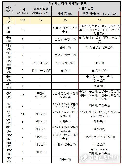 신규 시범사업 대상으로 선정된 시‧군‧구는 ▴(서울) 동대문구ㆍ중랑구ㆍ성북구ㆍ도봉구ㆍ노원구ㆍ서대문구ㆍ금천구ㆍ관악구ㆍ강동구, ▴(부산) 중구ㆍ동래구ㆍ남구ㆍ사하구ㆍ사상구, ▴(대구) 서구ㆍ달성군ㆍ군위군, ▴(광주) 동구, ▴(대전) 동구ㆍ서구, ▴(울산) 중구ㆍ남구ㆍ동구ㆍ북구ㆍ울주군, ▴(세종) 세종시, ▴(경기) 수원시ㆍ용인시ㆍ남양주시ㆍ안양시ㆍ시흥시ㆍ파주시ㆍ의정부시ㆍ이천시ㆍ동두천시, ▴(강원) 태백시ㆍ고성군, ▴(충북) 충주시ㆍ제천시ㆍ보은군ㆍ옥천군ㆍ영동군ㆍ단양군, ▴(충남) 태안군, ▴(전북) 익산시, ▴(전남) 나주시ㆍ무안군ㆍ신안군, ▴(경북) 고령군, ▴(경남) 창원시ㆍ진주시ㆍ거제시ㆍ남해군이다.