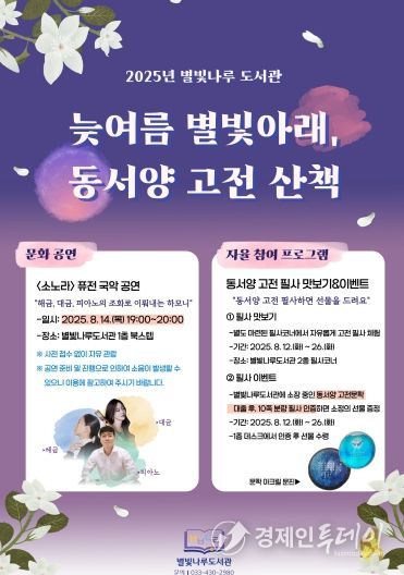 경제인투데이 류현민 기자 | 홍천군 별빛나루도서관은 오는 8월 12일부터 '늦여름 별빛아래, 동서양 고전 산책'이라는 주제로 독서문화진흥 행사를 운영한다.