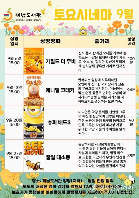 경제인투데이 류현민 기자 | 제주도교육청 제남도서관은 9월부터 오는 12월까지 매주 토요일마다 어린이·청소년·지역주민을 대상으로 제남도서관 강당에서 ‘토요시네마’를 운영한다.