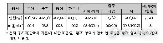 국어 영역의 경우, 사회탐구 영역 58.3%, 과학탐구 영역 22.4%이었으며, 사회탐구와 과학탐구 영역을 조합해 응시한 비율은 17.8%이었다.