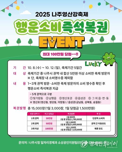 경제인투데이 류현민 기자 | 전라남도 나주시가 ‘2025 나주영산강축제’를 찾는 시민과 관광객들에게 특별한 즐거움과 함께 지역 상권 활력을 불어넣기 위해 ‘행운 소비 즉석 복권 이벤트’를 진행한다.