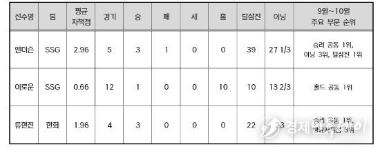 SSG 앤더슨은 9~10월 5경기에 선발 등판해 3승을 거두며 승리 부문 공동 1위에 올랐다. 평균자책점 2.96을 기록했고, 삼진 39개를 잡아내며 탈삼진 부문 월간 1위를 차지했다. 앤더슨은 9~10월 경기 당 평균 8개에 가까운 탈삼진을 잡으며 245탈삼진으로 정규시즌을 마무리했다.