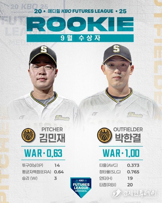 경제인투데이 류현민 기자 | 2025 메디힐 KBO 퓨처스리그의 9월 퓨처스 루키상 수상자로 투수 부문에는 상무 김민재가 WAR 0.63, 타자 부문에는 상무 박한결이 WAR 1.00을 기록하며 각각 선정됐다.