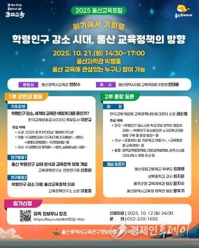 오는 21일 울산과학관 빅뱅홀에서 학생, 학부모, 시민, 교직원 등 200여 명이 참여한 가운데 ‘2025 울산교육 공개토론회(포럼)’를 연다.
