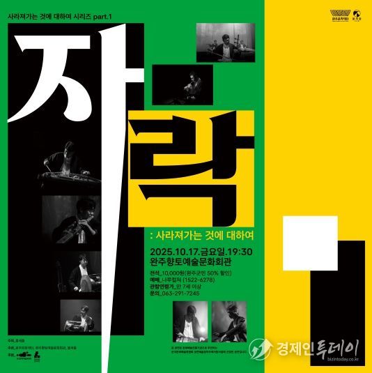 경제인투데이 류현민 기자 | 전북 완주군에 깊어가는 가을밤, 사라져가는 토속 민요의 숨결을 현대적인 감각으로 재조명하고 재해석한 특별한 국악 공연이 펼쳐진다. 완주문화재단은 오는 10월 17일, 완주향토예술문화회관에서 국악앙상블 불세출의 '자락: 사라져가는 것에 대하여' 공연을 개최한다