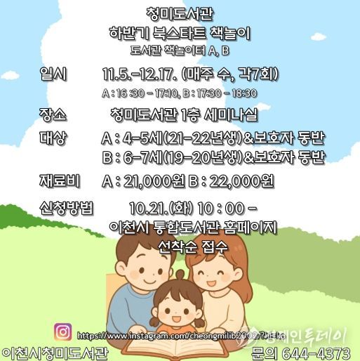 경제인투데이 류현민 기자 | 이천시 청미도서관은 오는 11월 5일부터 12월 17일까지, 유아와 보호자를 대상으로 ‘하반기 북스타트 책놀이’ 프로그램을 운영한다.