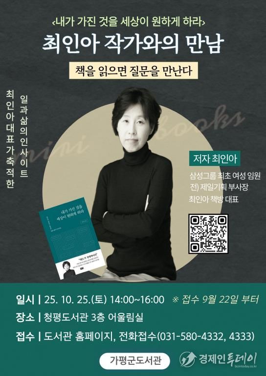 경제인투데이 류현민 기자 | 가평군은 이달 25일 오후 2시 청평도서관에서 ‘2025년 정기 작가와의 만남’ 강연을 개최한다. 이번 강연은 ‘최인아 책방’ 대표로 잘 알려진 최인아 작가를 초청해 ‘책을 읽으면 질문을 만난다’를 주제로 열린다.