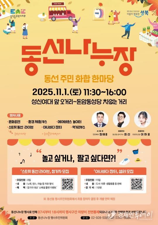 경제인투데이 류현민 기자 | 서울 성북구는 오는 11월 1일 오전 11시 30분부터 오후 4시까지, 성신여대 앞 오거리에서 돈암동성당 구간까지 이어지는 거리에서 ‘2025년 차 없는 거리 동선나누장’ 행사를 개최한다고 밝혔다.