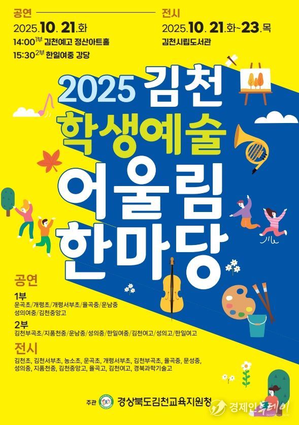 경제인투데이 류현민 기자 | 경상북도김천교육지원청은 오는 10월 21일 김천예술고등학교와 한일여자중학교에서 공연 행사를 열고, 김천시립도서관에서 전시 행사(21일-23일)를 통해 ‘2025 김천학생예술어울림한마당’을 개최한다.
