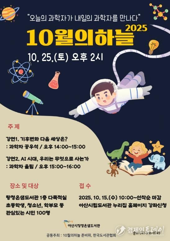 경제인투데이 류현민 기자 | 아산시는 오는 25일, 탕정온샘도서관과 꿈샘어린이청소년도서관에서 ‘10월의 하늘’ 과학 강연을 개최한다고 밝혔다.