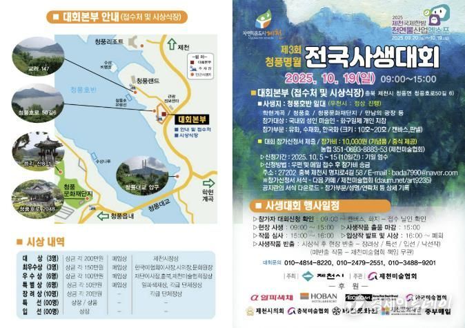 올해 대회는 총상금 2,150만원 규모로, 전국 각지에서 미술인과 대학생 등 성인 참가자들이 참여할 예정이다. 청풍명월 전국사생대회는 제천의 청정한 자연환경과 문화예술 인프라를 결합한 전국 규모의 미술행사로, 매년 참가자와 관람객이 늘며 지역을 대표하는 문화 브랜드로 성장하고 있다.