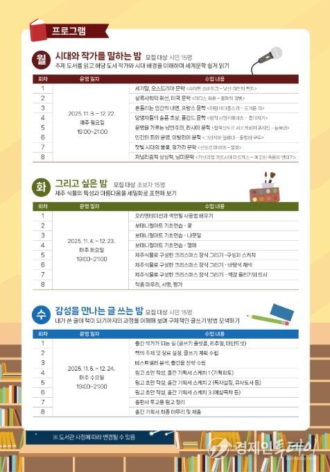 경제인투데이 류현민 기자 | 제주시 탐라도서관은 주간 시간대 도서관 이용이 어려운 주부와 직장인 등 시민들을 위해 다양한 야간 프로그램을 운영한다.