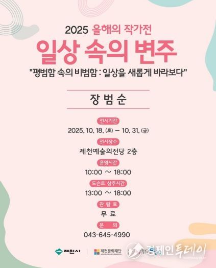 '올해의 작가전' 주제는 일상 속의 변주 ‘평범함 속의 비범함: 일상을 새롭게 바라보다’로 장범순 작가는 일상의 소재를 유머러스하고 해학적으로 표현한 작품 총 16점을 제천예술의전당 2층 전시 공간에 전시한다.