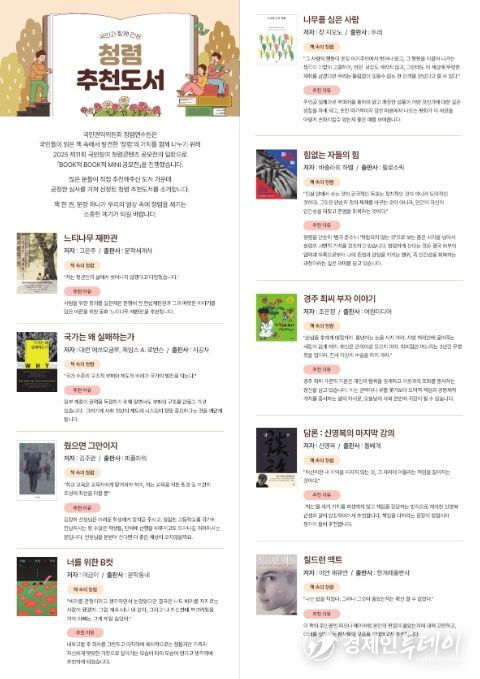 경제인투데이 류현민 기자 | 국민권익위원회 소속 청렴연수원은 '청렴 BOOK적 BOOK적' 공모전을 통해 청렴과 관련된 우수한 추천 도서 총 40권을 선정했다고 밝혔다.