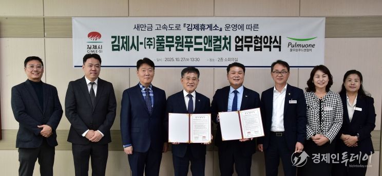 경제인투데이 류현민 기자 | 김제시는 27일 ㈜풀무원푸드앤컬처와 '새만금전주간' 고속도로 개통에 따라 새롭게 조성되는‘김제휴게소’운영에 따른 업무협약을 체결했다고 밝혔다.