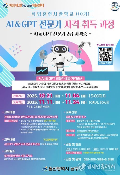 경제인투데이 류현민 기자 | 울산 남구 ‘여성내:일(My-Job)이음센터’는 급변하는 4차 산업혁명과 디지털 전환 가속화에 따라 여성의 전문 직무 역량 강화를 위한 프로그램으로 ‘AI · GPT 전문가 자격 2급 취득 과정’을 오는 11월 11일부터 24일까지 운영한다고 밝혔다.
