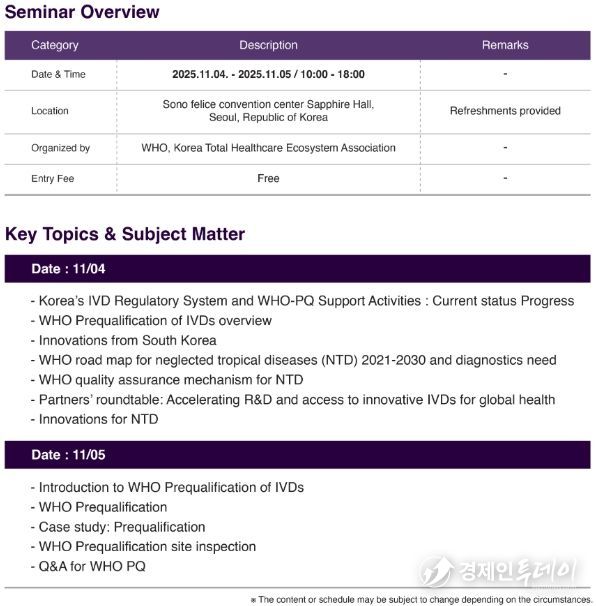 경제인투데이 류현민 기자 | 식품의약품안전처는 세계보건기구(WHO)의 사전적격성심사(PQ)팀과 공동으로 11월 4일부터 5일까지 서울 소노펠리체 컨벤션센터에서 국내 체외진단의료기기 제조업체의 해외 조달 시장 진출을 지원하기 위한 세미나를 개최한다고 밝혔다.