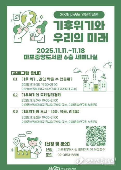 한편 마포중앙도서관에서는 같은 달 11월 11일부터 18일까지 ‘기후 위기와 우리의 미래’를 주제로 ‘하반기 마중도 인문학 살롱’을 운영한다.