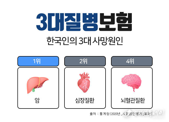 경제인투데이 류현민 기자 | 흔히 3대질병이라 일컫는 암, 심혈관질환, 뇌혈관질환은 통계청 발표자료에 따르면 한국인의 주요 사망원인 중에서 3위 폐렴을 제외하고 1~4위를 차지하고 있으며, 이전부터 지금까지도 살면서 가장 먼저 대비해야 하는 치명적인 질병으로 강조되고 있다. 이러한 중대질병에 대비하기 위하여 상기 세가지 치명적인 질병을 집중보장하는 3대질병진단비보험을 많이 가입하고 있다. 3대진단비보험은 각각의 질병을 중점적으로 보장하면서도 가입자 특성에 맞는 특약을 추가함으로써 종합건강보험으로도 활용할 수가 있다.