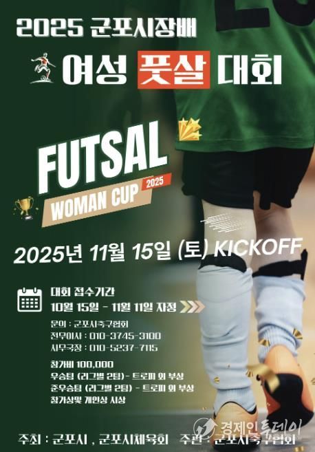 경제인투데이 류현민 기자 | 군포시는 여성 생활체육 참여 확대와 건전한 스포츠 문화 확산을 위해 ‘2025 군포시장배 여성 풋살대회’를 오는 11월 15일(토) 군포시 국민체육센터 축구장에서 개최한다.