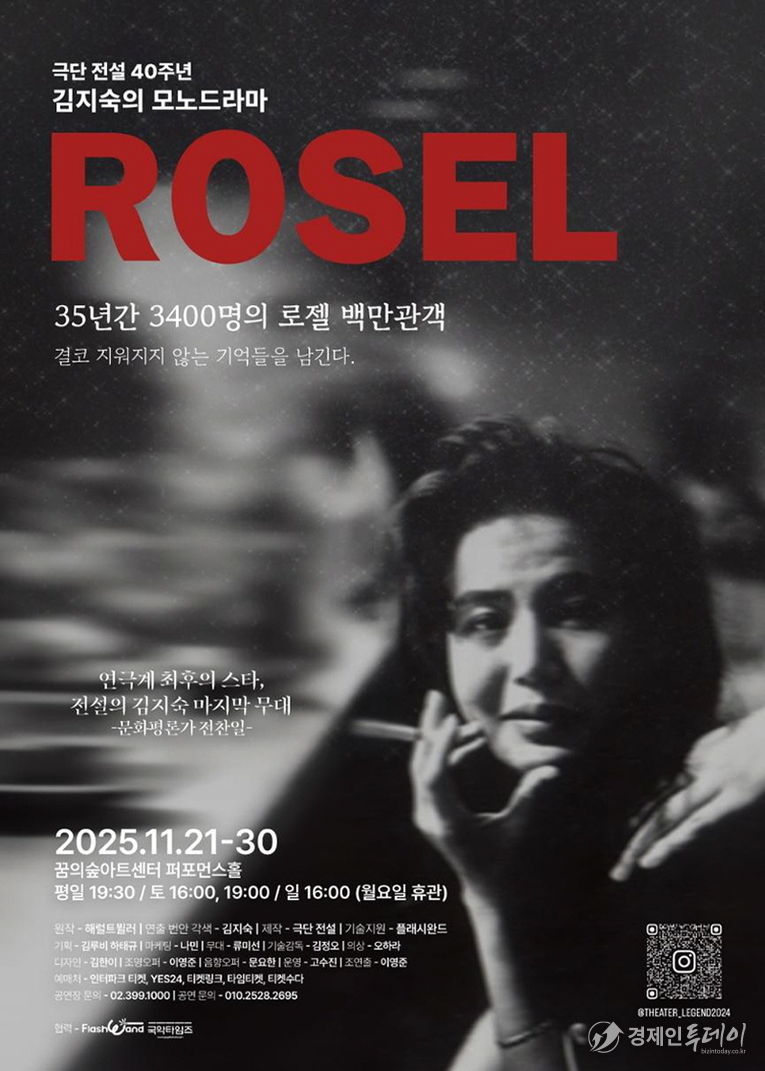 경제인투데이 류현민 기자 | 극단 전설 40주년 기념작이자 배우 김지숙의 마지막 공연인 모노드라마 〈로젤〉이 오는 11월 21일부터 30일까지 꿈의숲아트센터 퍼포먼스홀에서 막을 올린다. 35년간 3,400회 이상 공연되며 백만 명이 넘는 관객을 울린 이 작품은 여성의 주체성과 인간성의 회복을 그린 한국 연극사의 대표작으로 꼽힌다.