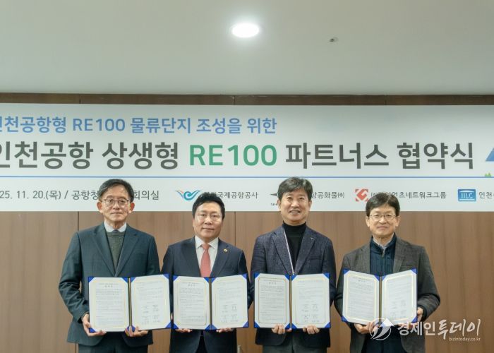 경제인투데이 류현민 기자 | 인천국제공항공사는 20일 오전 공항청사 회의실에서 물류단지 입주기업 3개社와 함께 ‘상생형 RE100 파트너스 업무협약(MOU)’을 체결했다고 밝혔다.