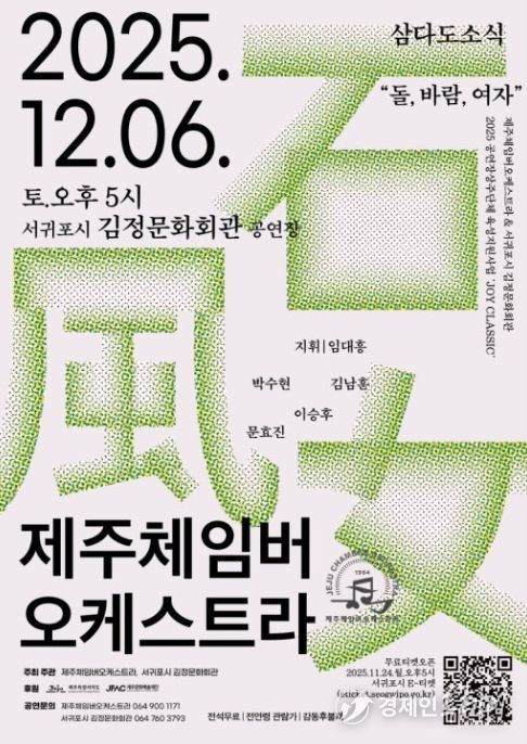 경제인투데이 류현민 기자 | 서귀포시는 2025년 공연장 상주단체 육성지원 사업의 일환으로, 제주체임버오케스트라의 '삼다도 소식'을 12월 6일 오후 5시에 김정문화회관 공연장에서 개최한다고 밝혔다.
