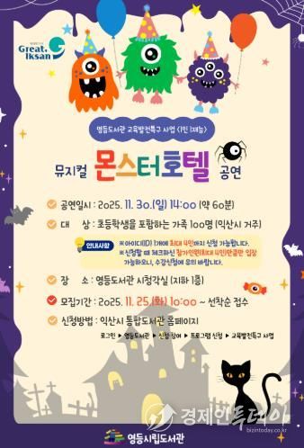 경제인투데이 류현민 기자 | 익산시는 오는 30일 오후 2시 영등도서관에서 어린이 뮤지컬 '몬스터 호텔'을 선보인다.