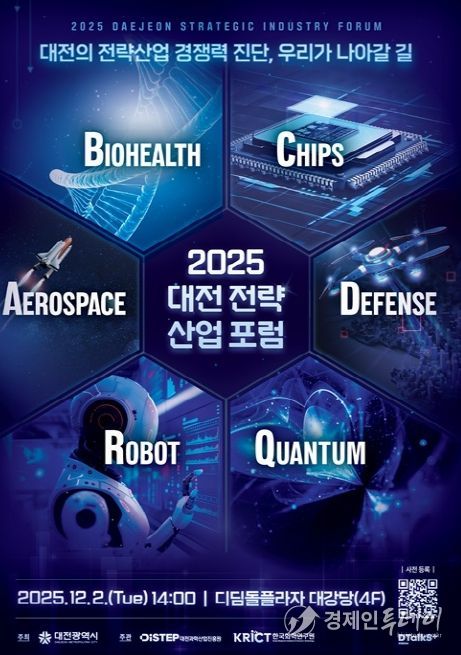 경제인투데이 류현민 기자 | 대전시는 대전과학산업진흥원(DISTEP), 한국화학연구원(KRICT)과 함께 오는 12월 2일 오후 2시, 한국화학연구원 디딤돌플라자 4층 대강당에서 ‘2025년 대전 전략산업 통합포럼’을 개최한다.