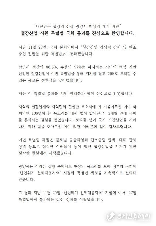 경제인투데이 류현민 기자 | 광양시는 지난 11월 27일 국회 본회의에서 '철강산업 경쟁력 강화 및 저탄소 전환 촉진을 위한 특별법(이하 ‘K-스틸법’)'이 통과된 데 대해 환영의 뜻을 밝혔다.