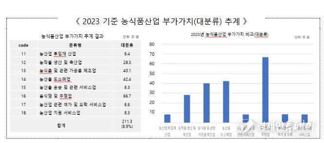 그간 농업 부가가치는 주로 쌀·채소·과일·축산업 등 1차 생산물 중심으로 집계되어 전 산업의 1% 수준에 불과한 것으로 알려져 왔으나, 연구 결과에 따르면 투입재를 비롯한 농산물의 가공·포장·유통 등 연관 산업과 스마트농업, 반려동물산업 등 신산업을 포함하면 그 비중이 ’23년 기준으로 전체 산업의 8.9% 수준, 부가가치 규모도 211조 원에 달하는 것으로 나타났다.