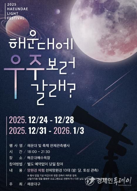 경제인투데이 류현민 기자 | 해운대구가 해운대빛축제 특별 이벤트 ‘우주 보러 갈래’를 12월 24~28일, 12월 31일~1월 3일에 운영한다.