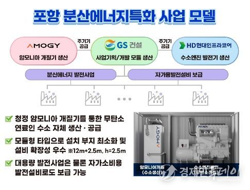 경북 포항 분산에너지 특화지역은 무탄소에너지 공급시스템 실증사업 모델이다. 포항시 흥해읍 일원의 영일만 산업단지(4,440천㎡)를 중심으로 그린 암모니아 기반의 수소엔진발전 실증을 통해 무탄소 분산전원을 상용화하여 청정전력을 지역 수요기업에 직접 공급한다는 계획이다. 분산사업자는 ㈜GS건설과 ㈜아모지, ㈜HD현대인프라코어가 컨소시엄을 구성하여 추진된다.