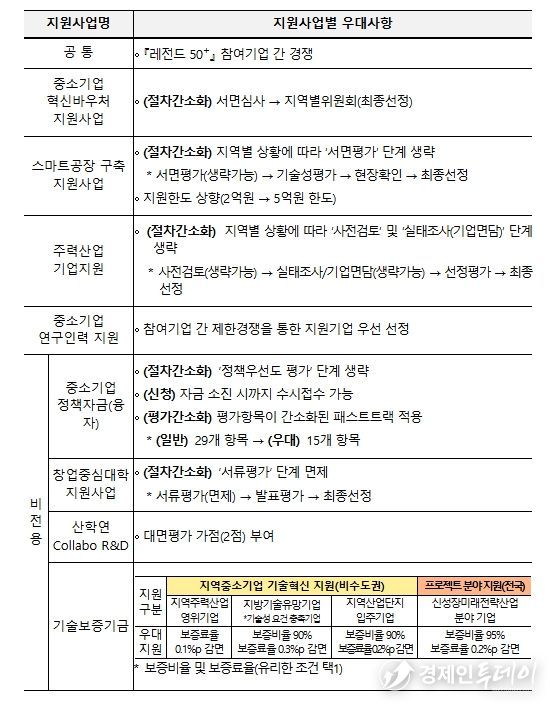 또한 정책자금, 창업·성장, R&D, 보증 분야에는 선정 절차 간소화, 평가 면제 또는 가점 부여, 지원한도 상향, 보증조건 우대 등 현장의 의견을 반영한 다양한 제도개선 사항이 적용된다.